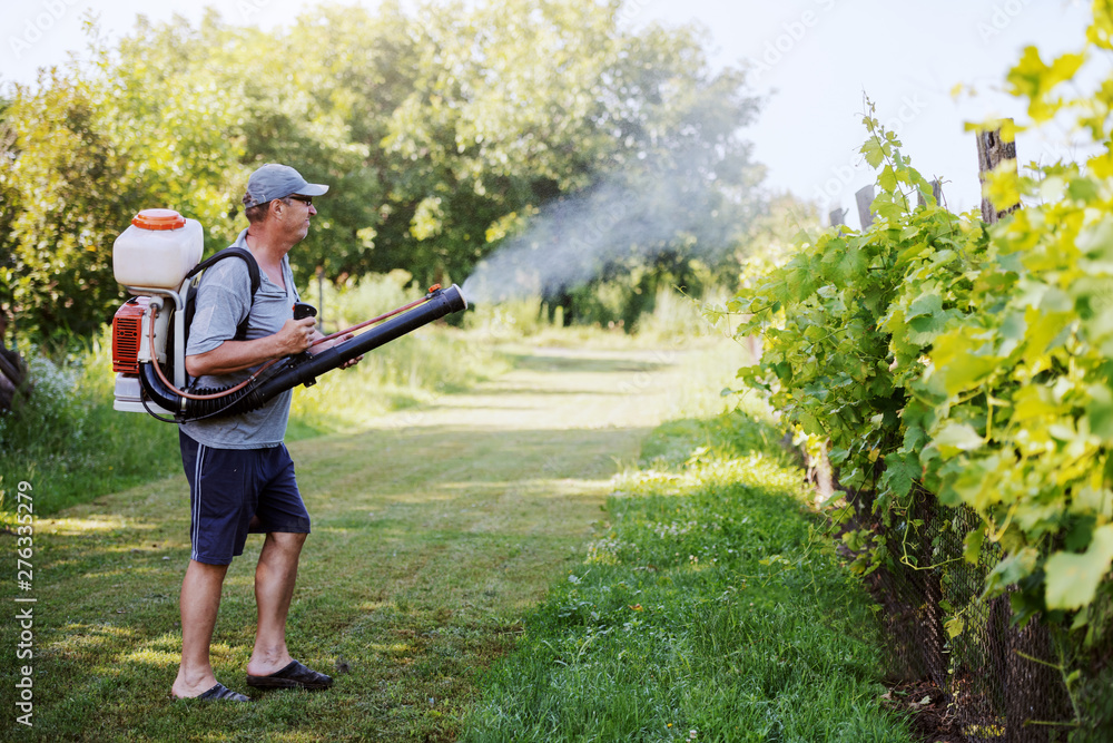 Side view of Caucasian mature peasant in working clothes, hat and with modern pesticide spray machine on backs spraying bugs in vineyard.