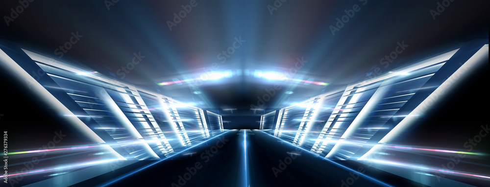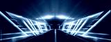 Empty stage, blue neon, abstract blue background. Rays of searchlights, light, abstract tunnel, corridor.