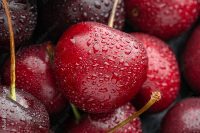 Close up of ripe cherries with Large collection of fresh red cherries. Ripe cherries background.