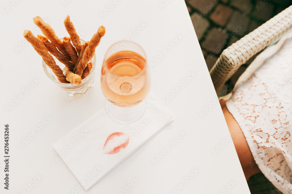 Flat lay image of rose wine with imprint of woman lipstick