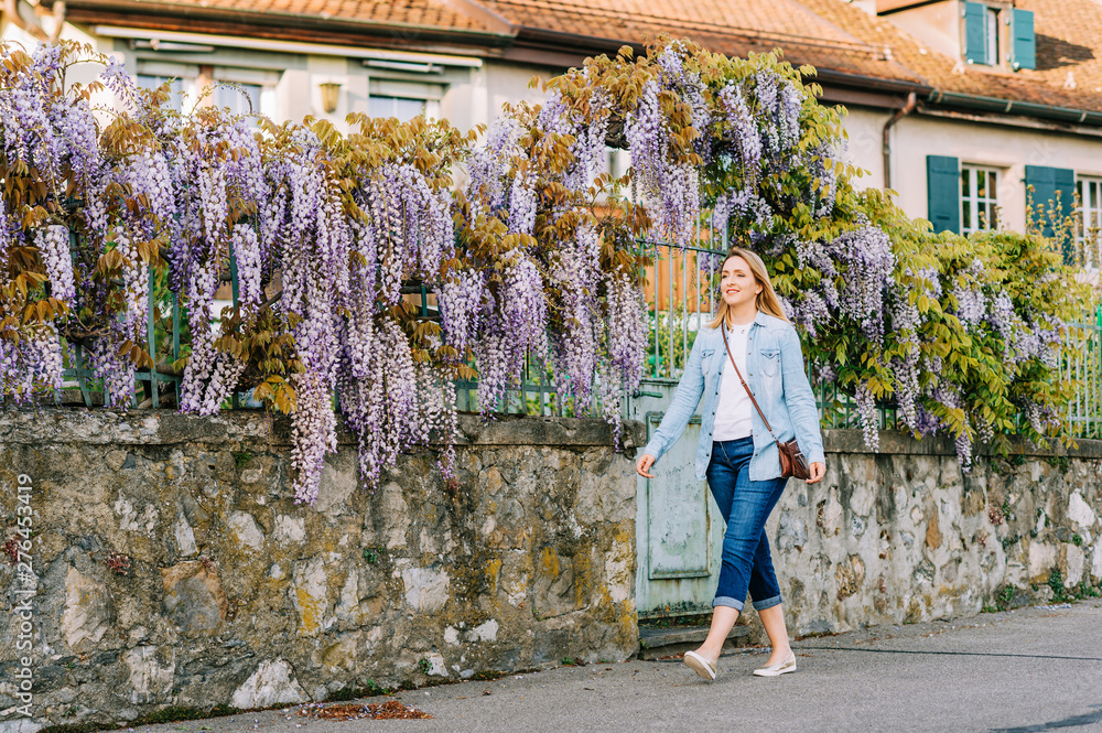 Spring portrait of elegant young woman wearing shirt and dark denim cropped jeans