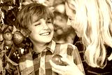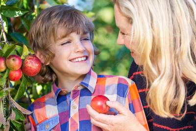 Mother Son, Woman and Boy Child Picking Eating a Red Apple