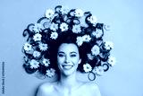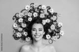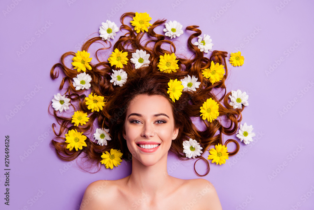 Close-up portrait of her she nice-looking charming cute attractive lovely nude naked feminine adorable cheerful wavy-haired lady blossom hairdo isolated over violet purple pastel background
