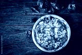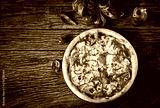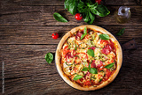 Italian pizza with chicken, salami, zucchini, tomatoes and herbs on vintage wooden background. Top view. Italian cuisine