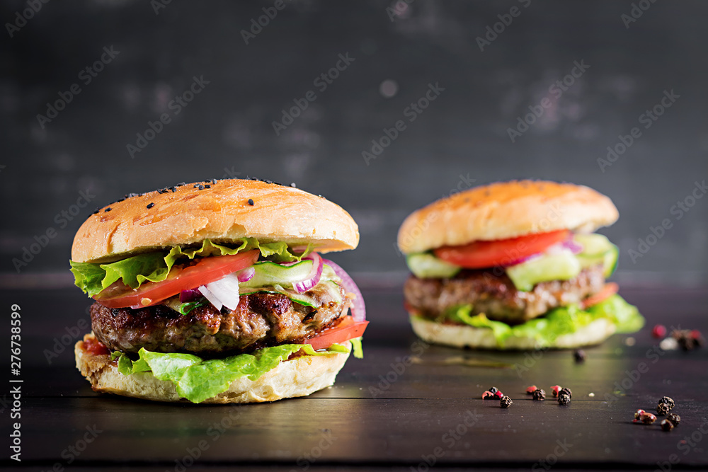Big sandwich - hamburger burger with beef, tomato, red onion and lettuce.