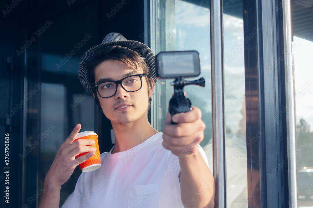 Young blogger with recording video on Action Camera with coffee cup in hand.