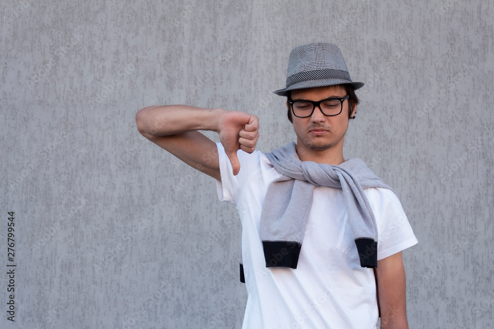 A young guy with a smile in a hat and glasses, showing thumbs down on a concrete background.