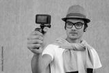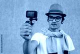 A young blogger with a hat and glasses, shoots a vlog video on an action camera.