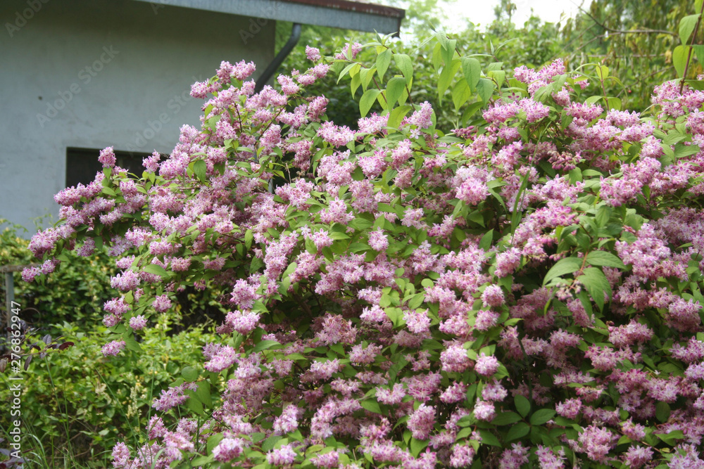 Deutzia "Tourbillon rouge" in bloom in the garden. Deutzia bush with beautiful pink flowers