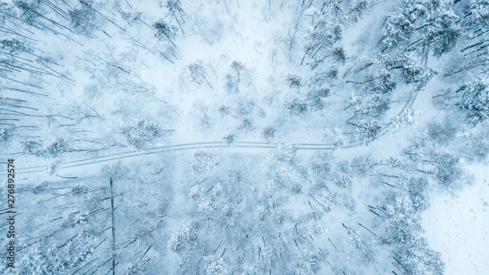 Aerial view of evergreen Christmass pine forest from above. bird's eye, drone shot. amazing natural winter background