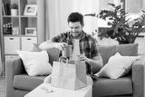 consumption, eating and people concept - smiling man unpacking takeaway food at home