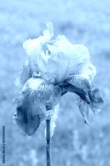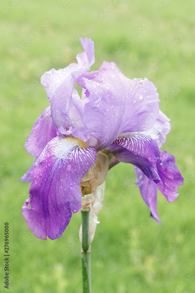 Iris flower with water drops after the rain on the background of green lawn