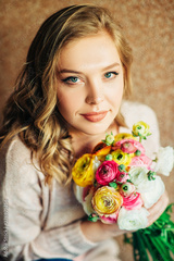 Portrait of beautiful young woman holding colorful buttercup flowers