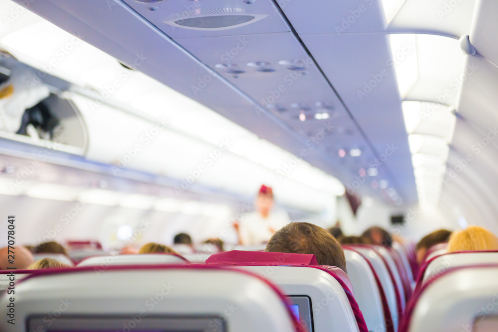 Interior of airplane with passengers on seats waiting to take off and stewardess in uniform walking the aisle