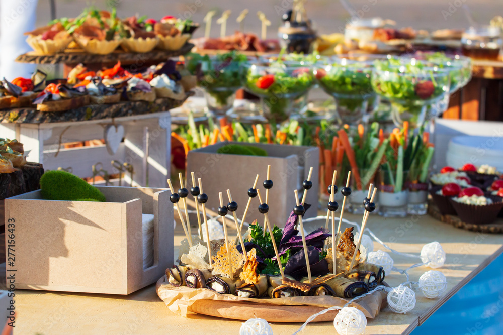 Beautifully decorated catering banquet table with different food snacks and appetizers with sandwich, caviar, fresh fruits on corporate christmas birthday party event or wedding celebration