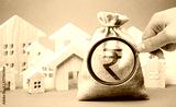Money bag with a sign indian rupee (rupiah) and wooden houses. The concept of real estate market. Pricing and demand. City budget. Rental and sale of housing. Mortgage and loan. Purchase of apartments