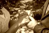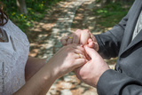 Ein frisch vermähltes Ehepaar vor dem symbolischen Weg des Lebens in einem Märchenwald, Deutschland