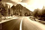 Road in summer forest at sunset in Italy. Beautiful mountain roadway, trees with green foliage and sunlight. Landscape with empty asphalt road through woodland, blue sky, high rocks. Travel in Europe