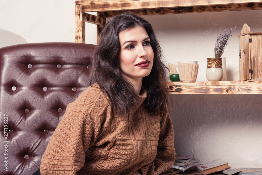 Beautiful brunette girl dressed in a knitted sweater sits in a leather chair