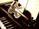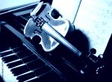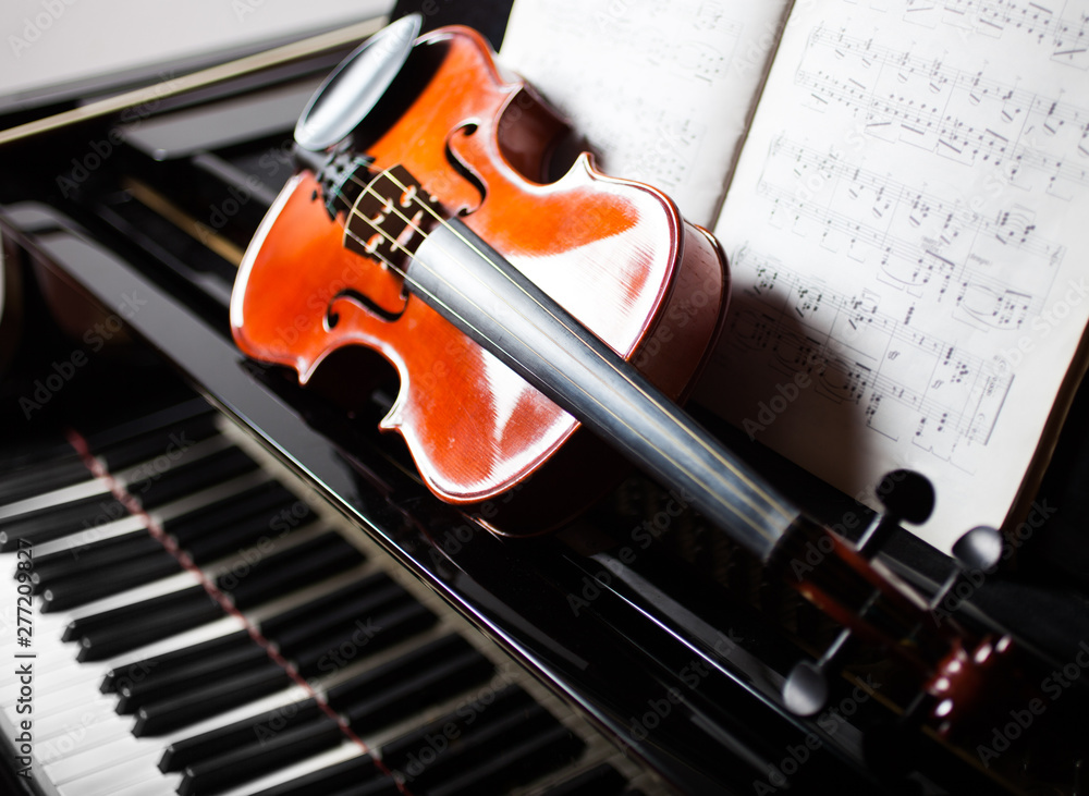 Classical music concept: violin and score on a piano