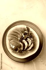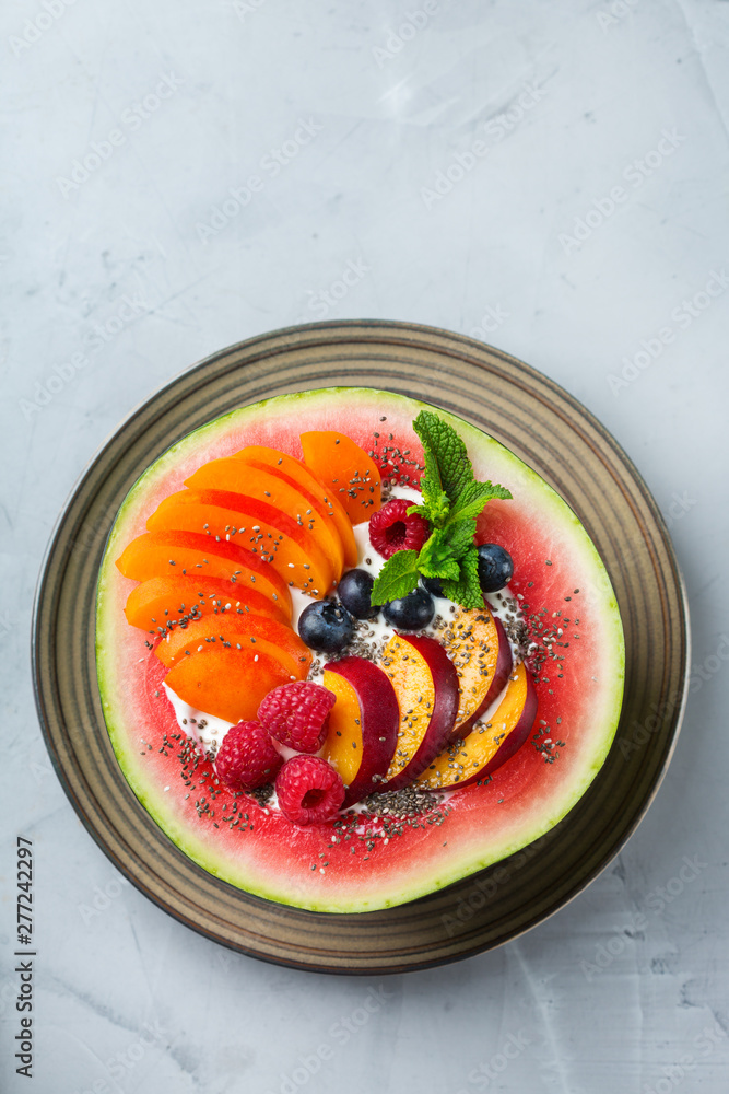 Healthy summer breakfast with fruit salad and yogurt in watermelon