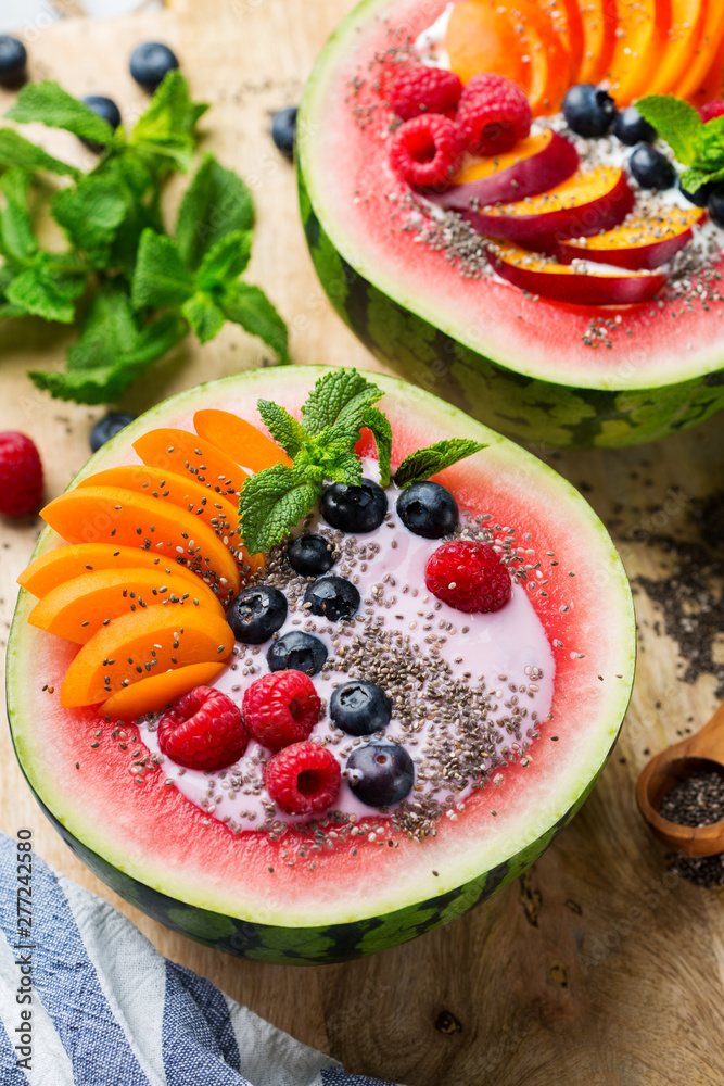 Healthy summer breakfast with fruit salad and yogurt in watermelon