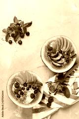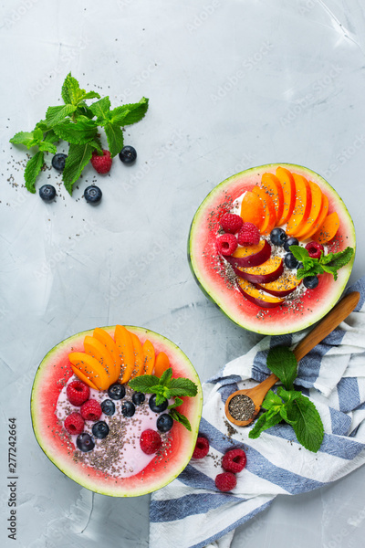 Healthy summer breakfast with fruit salad and yogurt in watermelon