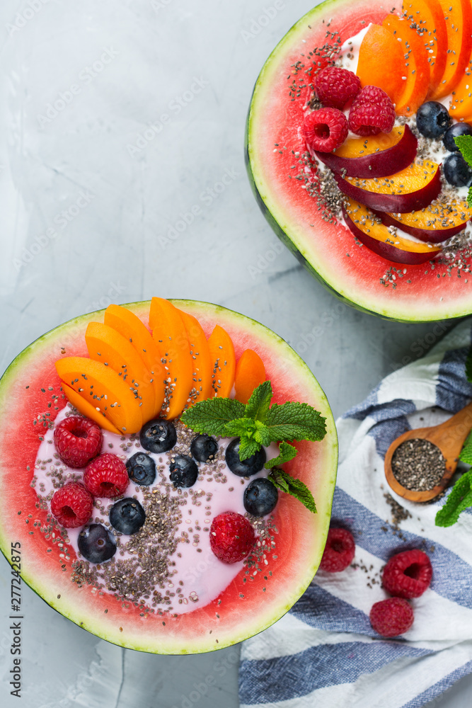 Healthy summer breakfast with fruit salad and yogurt in watermelon