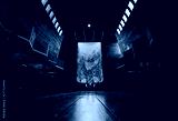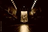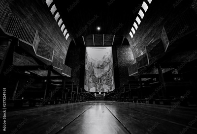 Perspective view in church. A few people sit on wooden bench with many of empty bench in church on Sunday. Black and white scene of wooden building interior with ceiling lamp. Europe architecture.