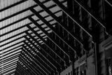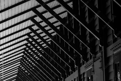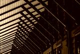 Wooden fixed awning and the walls of the building in Thai style along sidewalk of house. Black and white wooden awning structure. Exterior design of wood building. Sun control structure of home.