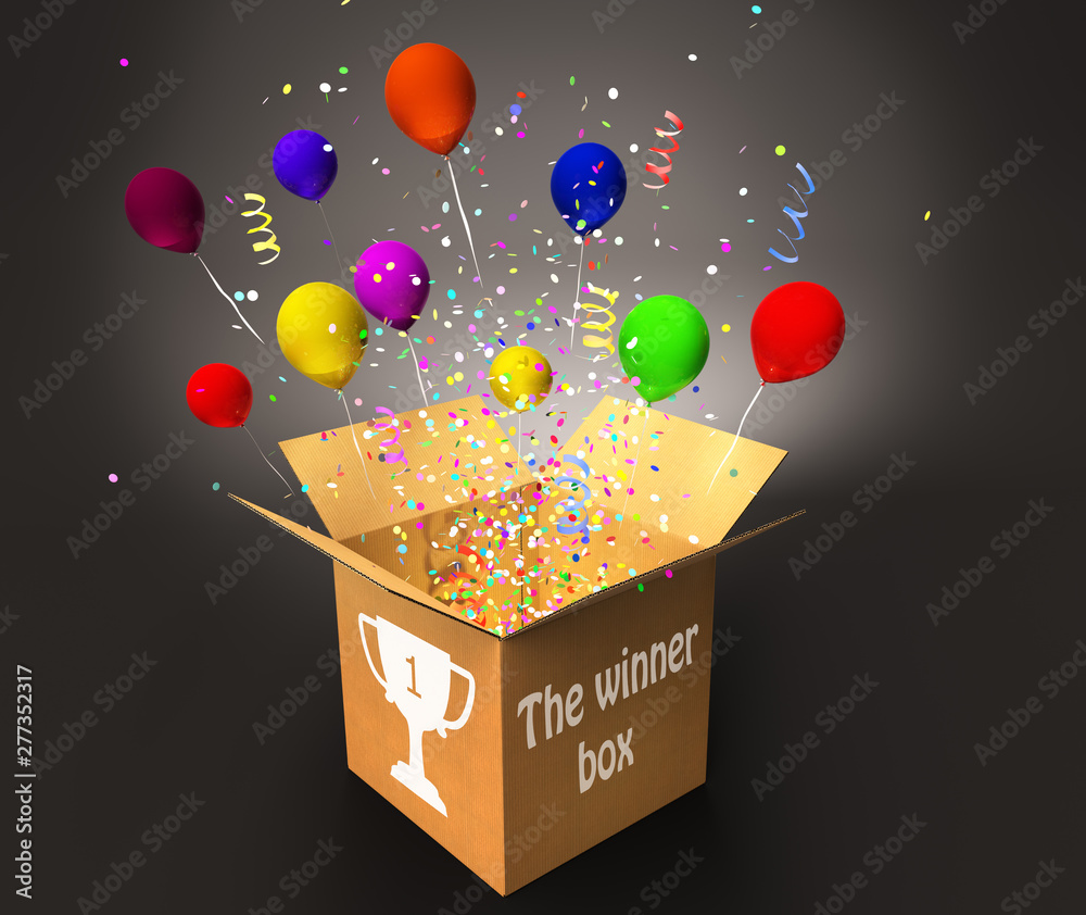 winner box with confetti and colorful balloons, win and prizes concept 3D illustration