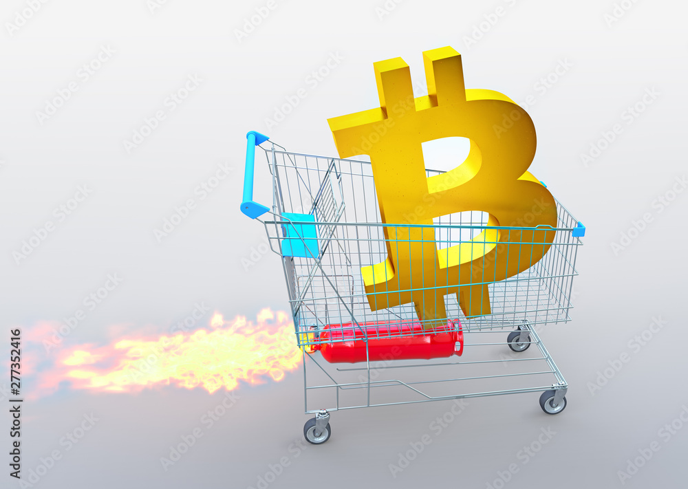 a golden bitcoin icon on trolley with rocket, price rises concept, 3D illustration