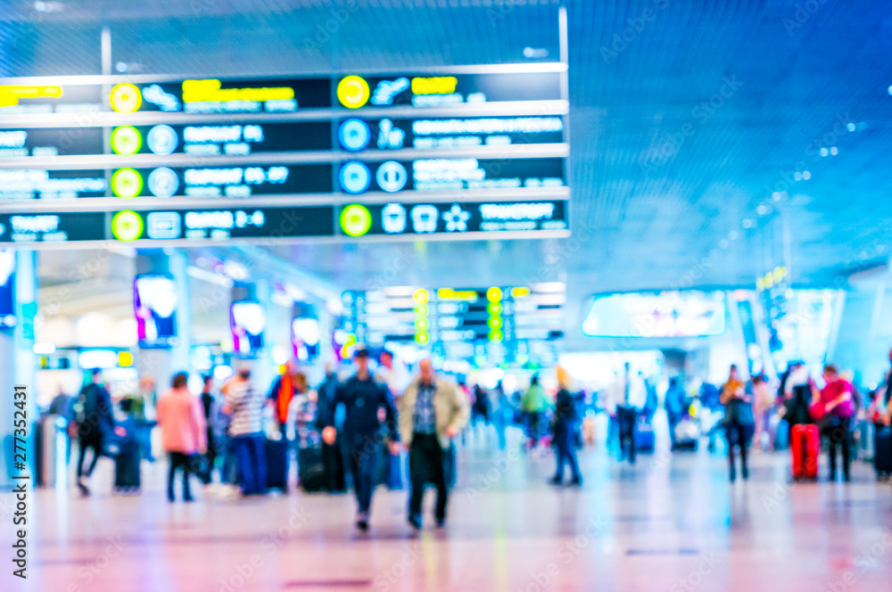Airport terminal blurred crowd of travelling people. Traveling concept background.