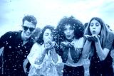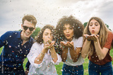 Group of four friends having fun at the park blowing confetti - Millennials playing together at sunset