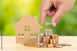 Coin stack and model house on wooden desk on green tree background, with hand putting money, mortgage concept