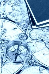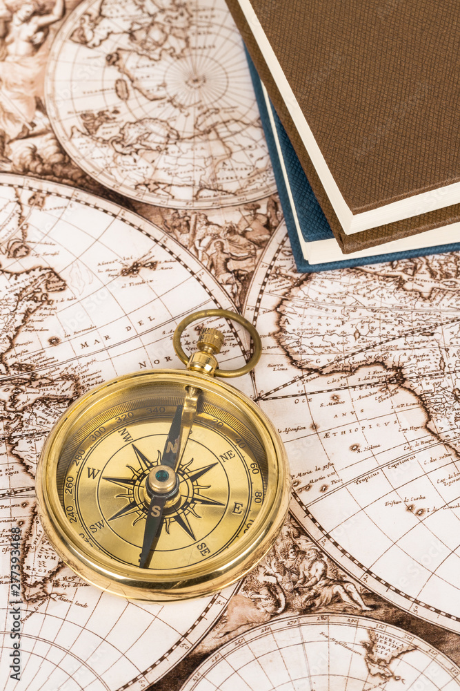 Compass on vintage ancient map with book, concept for direction transportation and travel