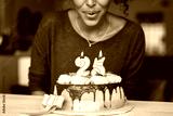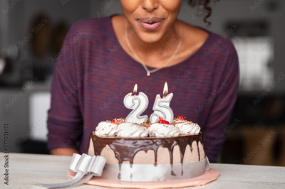 African woman blowing birthday candles on cake