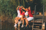 Happy group of young people drinking beer on a dock by the river during the summer sunny day