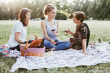 Mother and two daughters make picnic in a park at sunset during summer