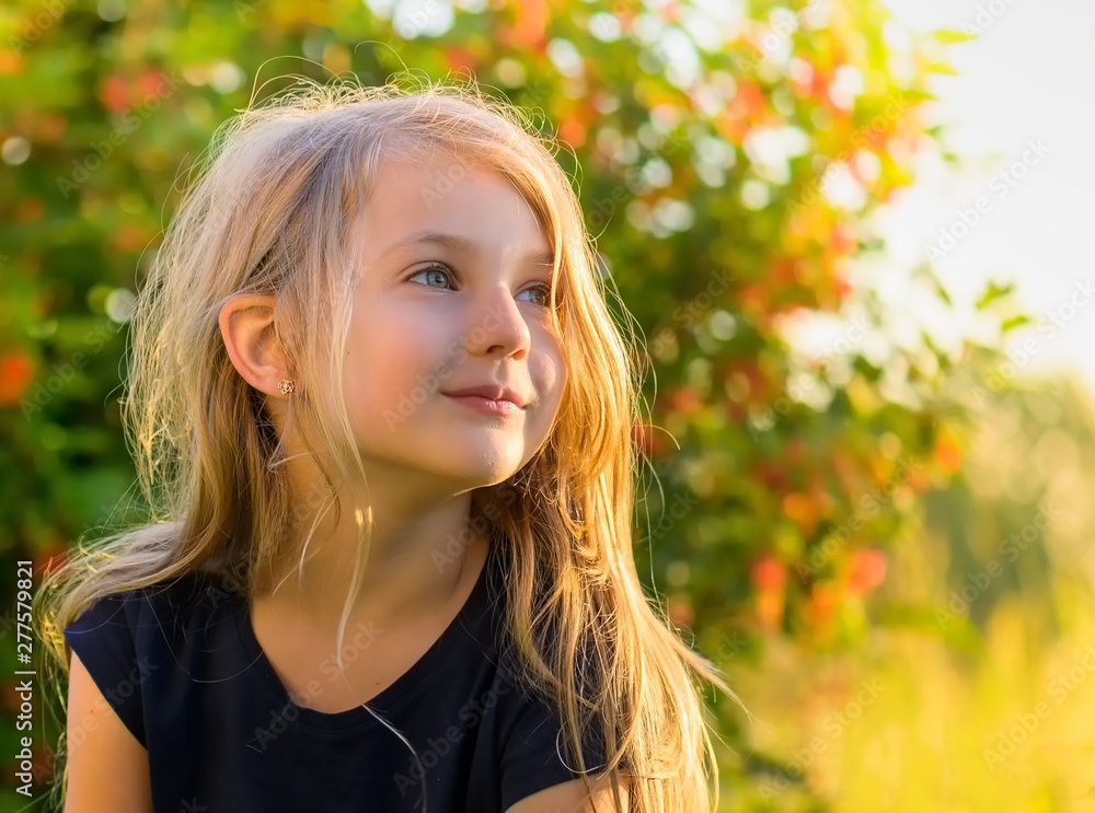 Portrait of little blond girl at sunset