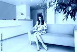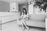 In full growth Portrait of Smiling young business woman sitting on the yellow sofa in the business hall and writing in notebook, makes notes of useful information, dressed elegantly. Copy space.