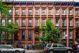 Scenic view of a classic Brooklyn brownstone block with a long facade and ornate stoop balustrades on a summer day in Clinton Hills, Brooklyn