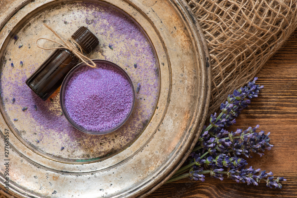 Lavender, bath salt and lavender oil on an old metal plate.