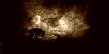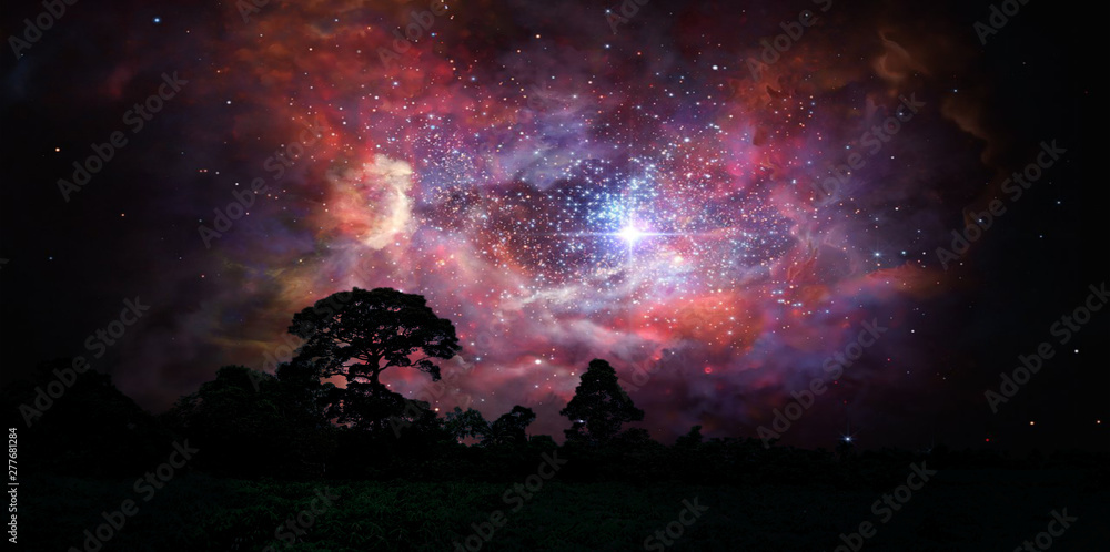 blur ancient stardust nebula back on night cloud sky over silhouette forest