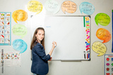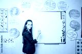 girl writes in English on the blackboard. girl stands near the chalkboard in English class.