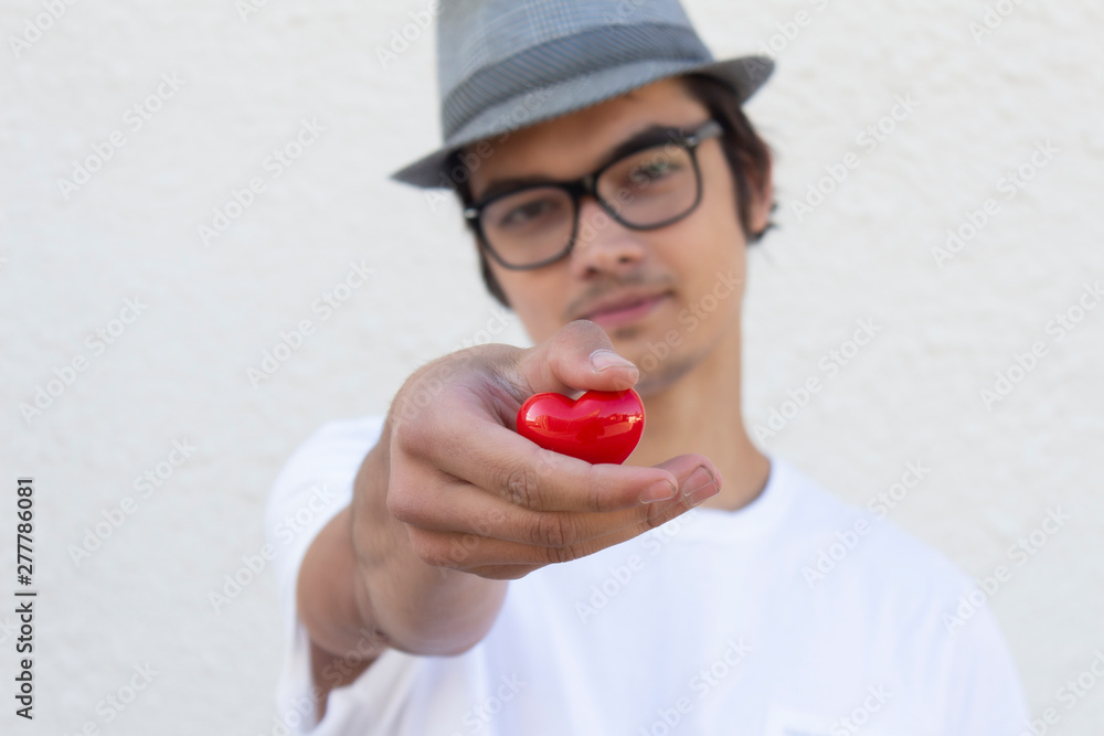 Attractive guy with glasses and a hat holding a heart in his hand. Declaration of love from a guy.