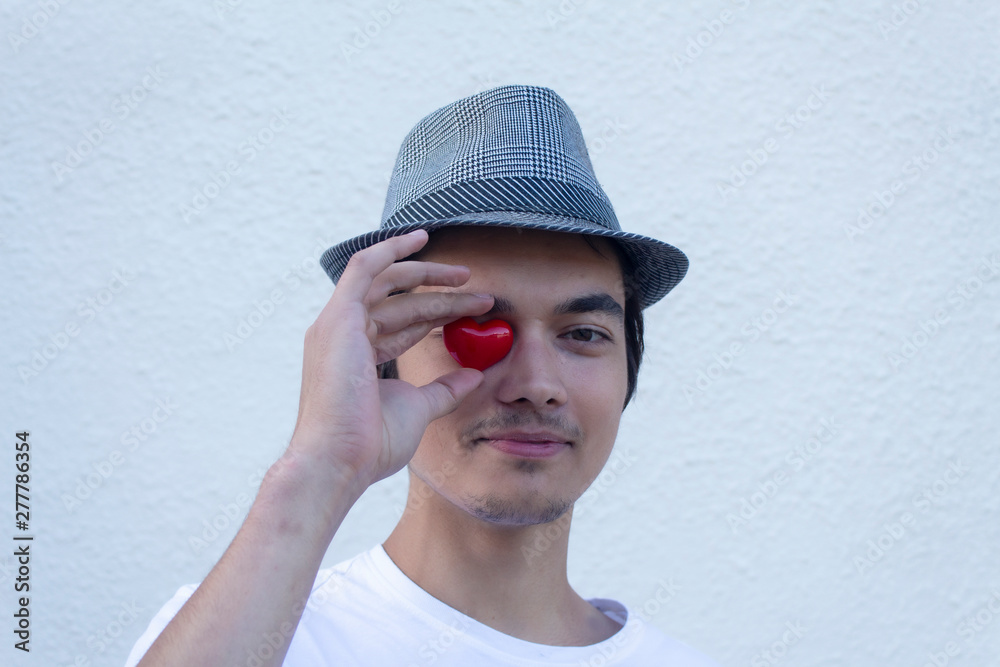 Attractive guy with glasses and a hat holding a heart in his hand. Declaration of love from a guy.