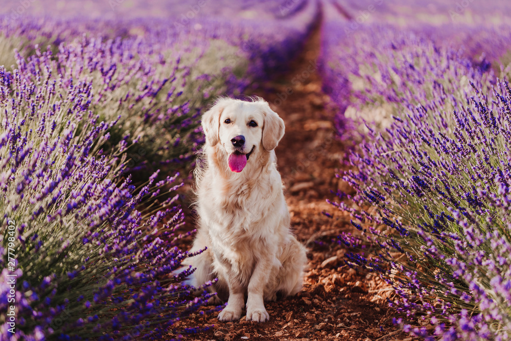 Adorable Golden Retriever dog in lavender field at sunset. Beautiful portrait of young dog. Pets outdoors and lifestyle