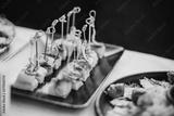 Delicious food table at wedding reception. Fish finger appetizers with onion on table at wedding or christmas feast. Luxury catering concept