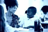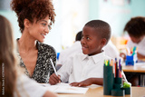 Woman Elementary School Teacher Giving Male Pupil Wearing Uniform One To One Support In Classroom